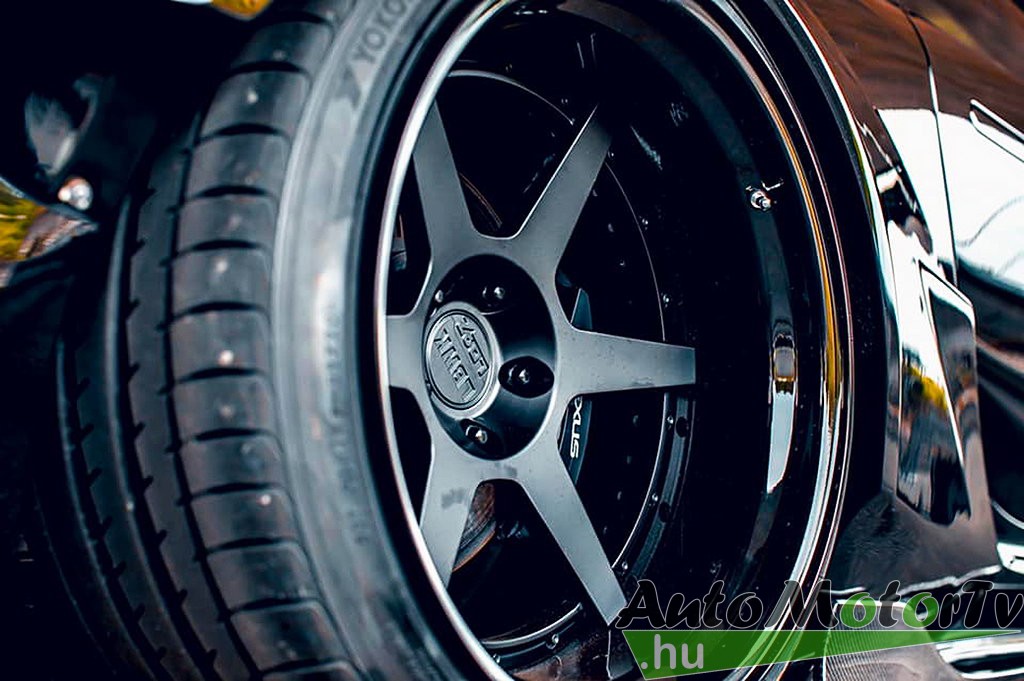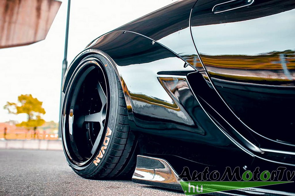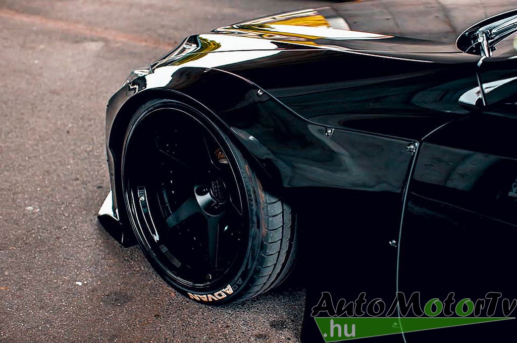 Minden aerodinamikai elem festetlen, lakkozott karbon kompozitból készül, és míg ezek finoman simulnak bele az autó egészébe, a hasas kerékdob-idomokat a Liberty Walk szokása szerint látható csavarokkal rögzítették.