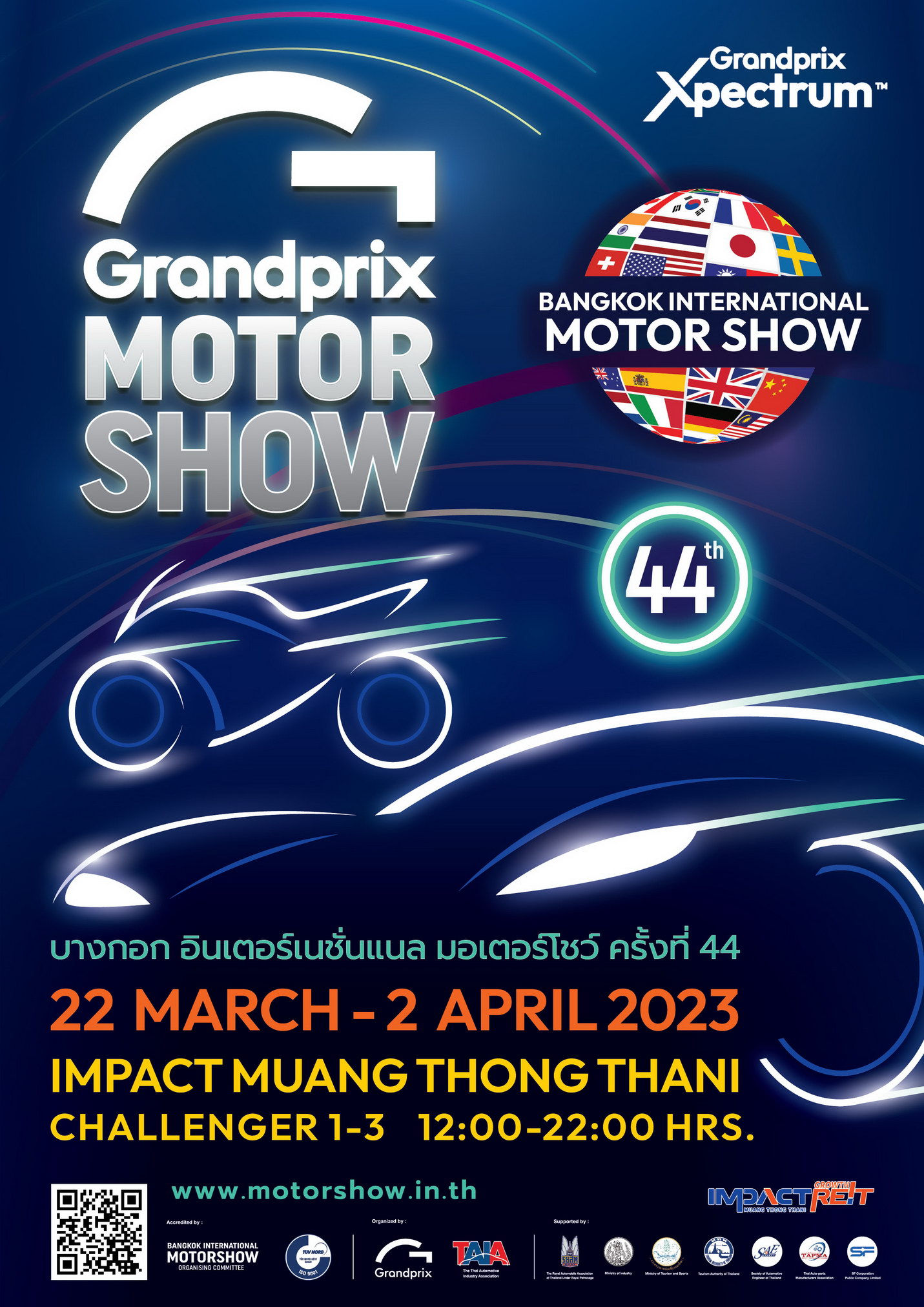 Grand Prix International Public Company Limited announces the readiness in organizing the 44th Bangkok International Motor Show, which will be held under the concept of “COLORFUL EXPERIENCE”, affirming the greatness as the leader of automotive shows in Thailand. More than 40 car and motorcycle brands are confident and have confirmed their participation by presenting their new models with the latest technology on display covering the entire exhibition space from 22 March 2023 to 2 April 2023 at Challenger Hall, IMPACT Muang Thong Thani.